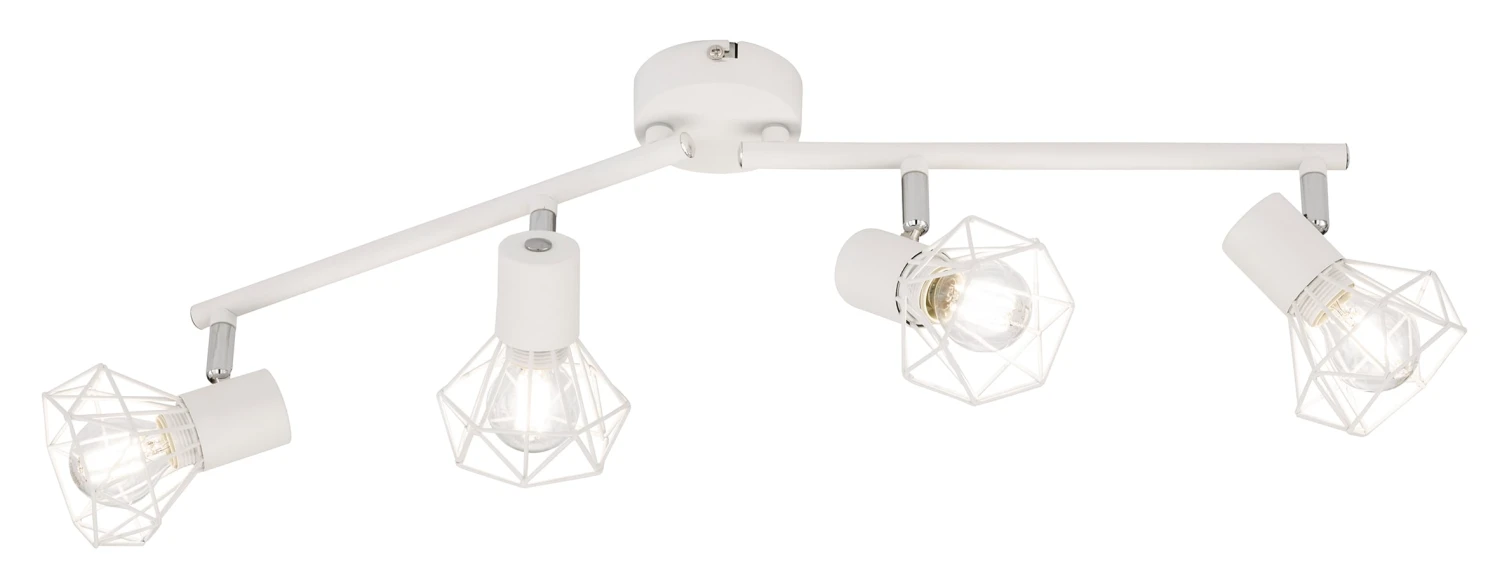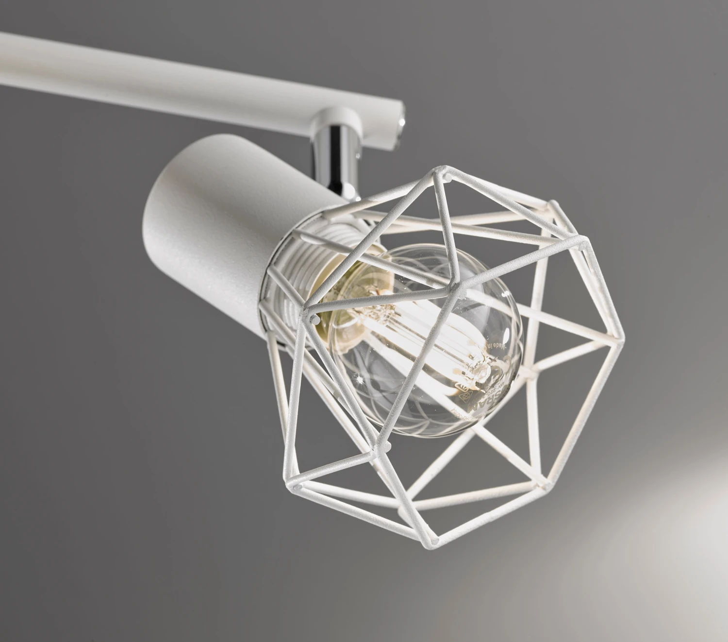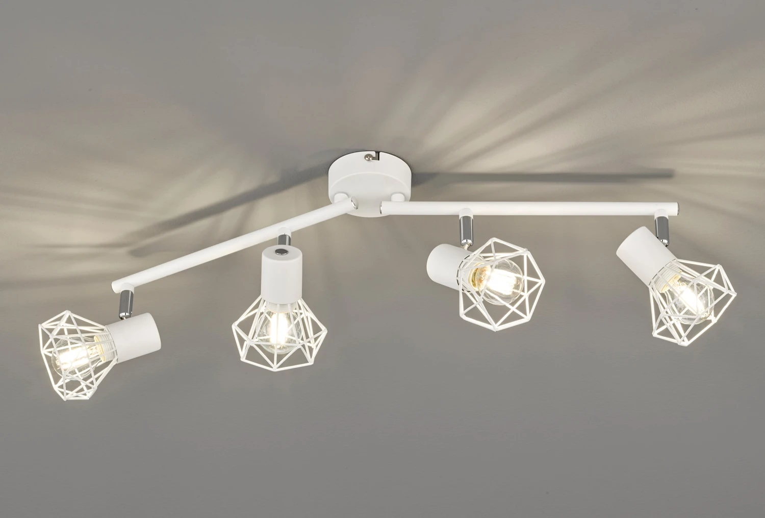 Die weiße Oberfläche mit den filigranen Metallschirmen gibt dem Artikel das gewisse Etwas. Die beiden Schenkel dieser Leuchte sowie die Spotköpfe sind individuell verstellbar und geben Ihnen die Freiheit, Licht punktuell einzusetzen. Mit einer Breite von 60 cm und einer Deckenausladung von 18 cm ist der Artikel individuell platzierbar. Kombiniert mit den passenden Artikeln dieser Serie und oder mehrfach platziert sind diese Leuchten ein echter Hingucker. Bestückt wird diese Wand- und Deckenleuchte mit 4 x E14 max.40 Watt. Das Leuchtmittel ist im Lieferumfang nicht enthalten. Es können Leuchtmittel mit Energieeffizienklasse A bis G eingesetzt werden.