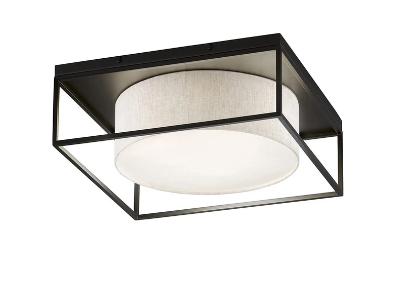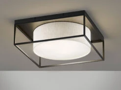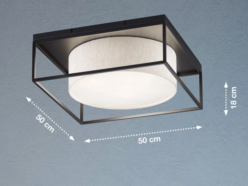 Die moderne Design Deckenleuchte setzt sich aus einem runden Leinenstoffschirm in Sandfarben mit weißer Acrylblende und einem sandschwarzen, eckigen Metallrahmen zusammen. Die Gesamgröße der Leuchte beträgt 50×50 cm mit einer Deckenabhängung von 18 cm. Der moderne Look wird durch den angesagten Farb- und Materialmix perfekt abgerundet und sorgt für ein tolles Erscheinungsbild.
