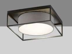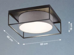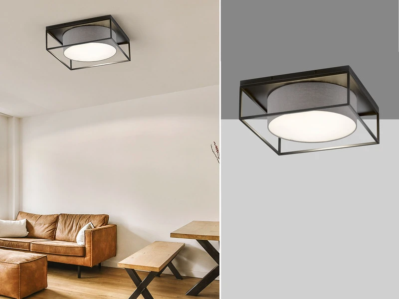Die moderne Design Deckenleuchte setzt sich aus einem runden Leinenstoffschirm in Grau mit weißer Acrylblende und einem sandschwarzen, eckigen Metallrahmen zusammen. Die Gesamgröße der Leuchte beträgt 60×60 cm mit einer Deckenabhängung von 18 cm. Der moderne Look wird durch den angesagten Farb- und Materialmix perfekt abgerundet und sorgt für ein tolles Erscheinungsbild.