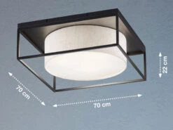 Die moderne Design Deckenleuchte setzt sich aus einem runden Leinenstoffschirm in Sandfarben mit weißer Acrylblende und einem sandschwarzen, eckigen Metallrahmen zusammen. Die Gesamgröße der Leuchte beträgt 70×70 cm mit einer Deckenabhängung von 22 cm. Der moderne Look wird durch den angesagten Farb- und Materialmix perfekt abgerundet und sorgt für ein tolles Erscheinungsbild.