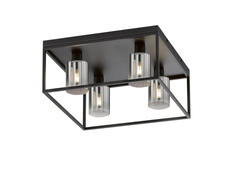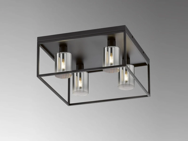 Die viereckige Design Deckenleuchte setzt sich aus vier zylinderförmigen Rauchglasschirmen mit einem Durchmesser von jeweils 8,5 cm und einem sandschwarzen Metallrahmen zusammen. Die Gesamtgröße der Leuchte beträgt 45×45 cm, die Deckenabhängung 20,5 cm. Der Retro Look wird durch den angesagten Farb- und Materialmix perfekt abgerundet und sorgt für ein tolles Erscheinungsbild.