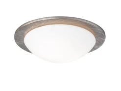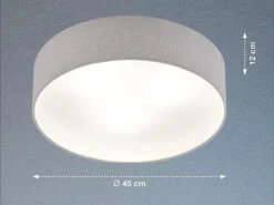 Das zeitlose Erscheinungsbild der Deckenleuchte sorgt im Zusammenspiel mit der satinierten Abdeckung aus Acryl für ein wohnliches Licht Ambiente. Der hellgraue Schirm aus Leinen Stoff hat einen Durchmesser von 45 cm und ist mit einer Höhe von 12 cm recht flach.