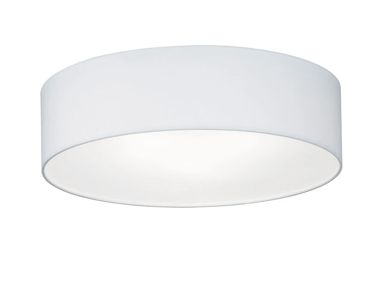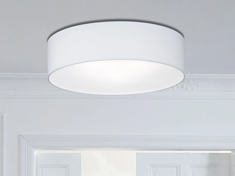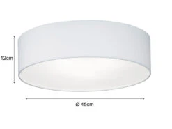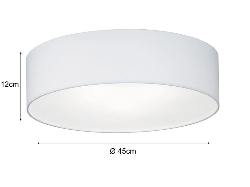 Das zeitlose Erscheinungsbild der Deckenleuchte sorgt im Zusammenspiel mit der satinierten Abdeckung aus Acryl für ein wohnliches Licht Ambiente. Der weiße Schirm aus Chintz Stoff hat einen Durchmesser von 45 cm und ist mit einer Höhe von 12 cm recht flach.