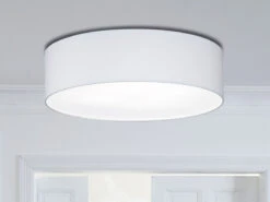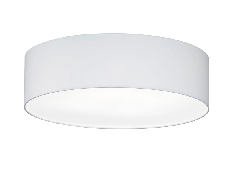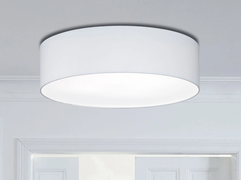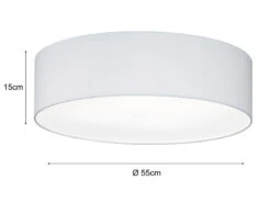 Das zeitlose Erscheinungsbild der Deckenleuchte sorgt im Zusammenspiel mit der satinierten Abdeckung aus Acryl für ein wohnliches Licht Ambiente. Der weiße Schirm aus Chintz Stoff hat einen Durchmesser von 55 cm und eine Deckenabhängung von 15 cm.
