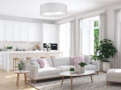 Der weiße Stoffschirm mit stilvollem Dekor hat einen Durchmesser von 40cm und eine Höhe von 12cm. Das edle Erscheinungsbild der Deckenleuchte sorgt im Zusammenspiel mit der unteren, satinierten Acrylabdeckung für ein harmonisches Ambiente. Bei Verwendung von entsprechend warmweißen Leuchtmitteln lässt sich dieser Effekt noch unterstreichen, indem die Deckenleuchte ein besonders wohnliches Licht zaubert.