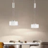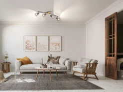 Das besondere Erscheinungsbild des 60cm langen und 11cm breiten Deckenstrahlers entsteht nicht zuletzt durch die vier Gitter Lampenschirme, die den Blick freigeben auf die innenliegenden Leuchtmittel. Besonders im eingeschalteten Zustand entfaltet der Strahler, dessen Spots und Arme schwenkbar sind, seine gesamte Schönheit, indem die Gitterform der Lampenschirme für interessante Lichtspiele sorgt.
