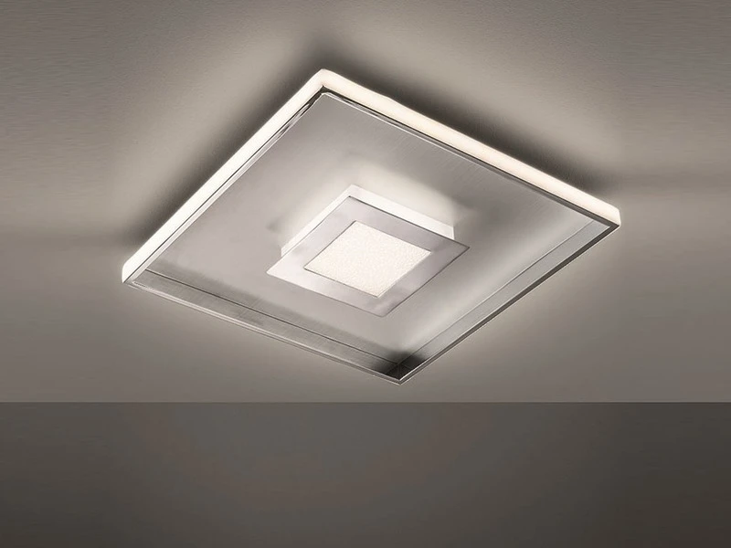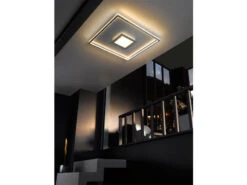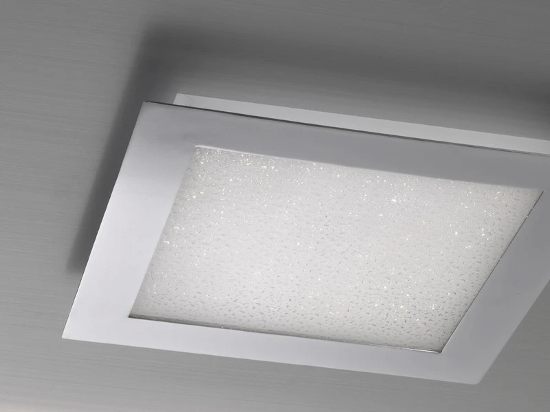 Ihre gesamte Schönheit zeigt die Deckenleuchte vor allem im eingeschalteten Zustand: Zum einen erhellt das umlaufende LED Licht den äußeren Rand, was eine angenehme, indirekte Beleuchtung schafft. Zum anderen sorgt das mittige Licht durch den aufgesetzten, chromfarbenen Rahmen und das weiße Acrylglas mit feinem Dekor für faszinierende Lichtspiele.