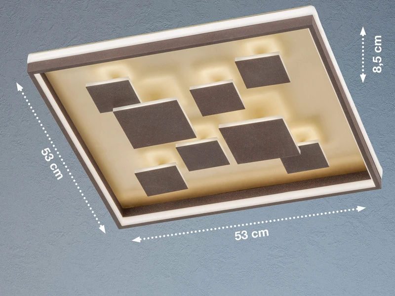 Das Deckenlicht hat eine Größe von 53 x 53 cm und ist mit einer Höhe von 8,5 cm sehr flach.