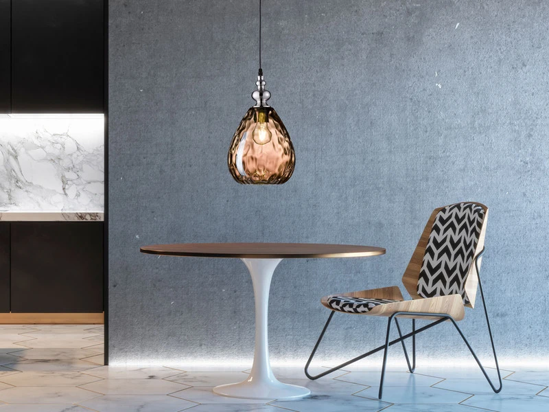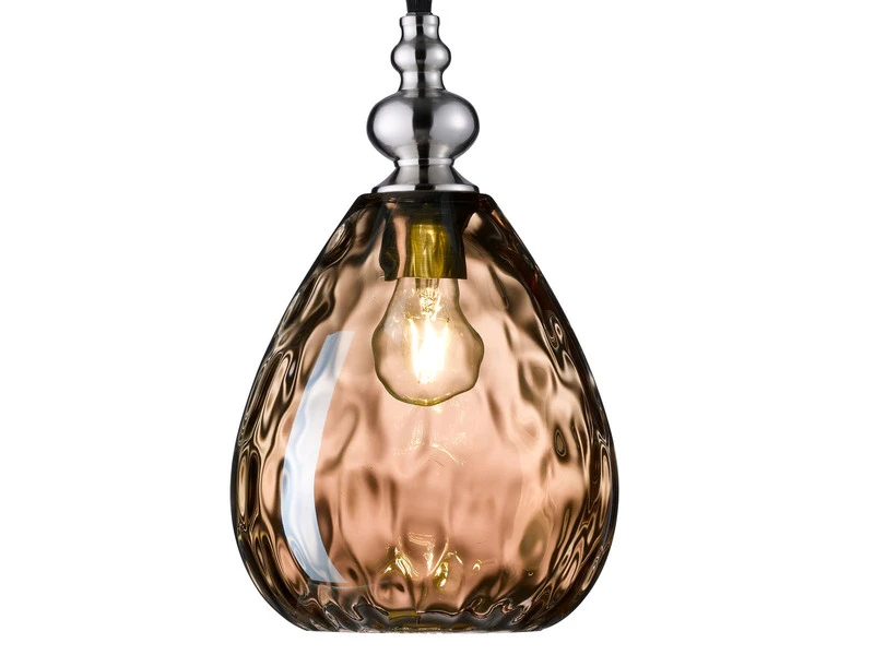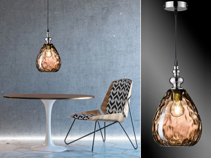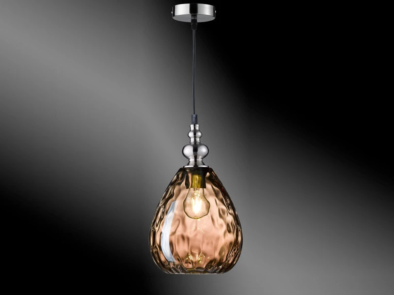 Der Schirm hat einen Durchmesser von 20 cm, ist 25 cm hoch und aus Amberfarbenem Glas gefertigt. Besonders im eingeschalteten Zustand entfaltet die HĂ€ngelampe ihre gesamte Schönheit, indem sie fĂŒr besondere Lichteffekte sorgt.