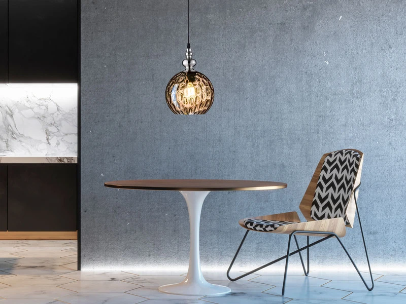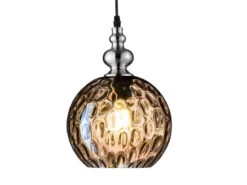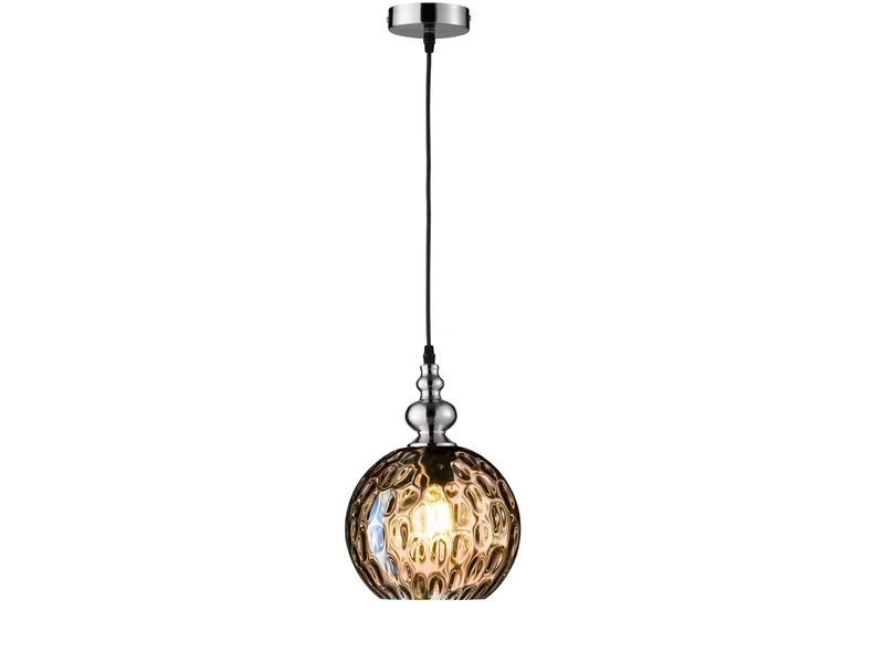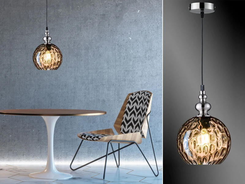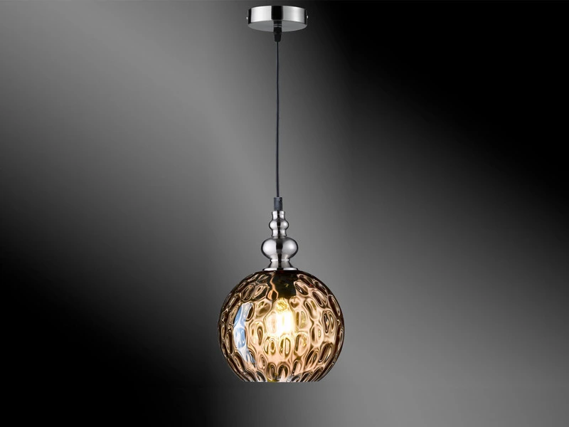 Die Kugel hat einen Durchmesser von 20 cm und ist aus Amberfarbenem Glas gefertigt. Besonders im eingeschalteten Zustand entfaltet die Hängelampe ihre gesamte Schönheit, indem sie für besondere Lichteffekte sorgt.