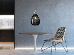 Der Schirm hat einen Durchmesser von 20 cm, ist 25 cm hoch und aus rauchfarbenem Glas gefertigt. Besonders im eingeschalteten Zustand entfaltet die Hängelampe ihre gesamte Schönheit, indem sie für besondere Lichteffekte sorgt.