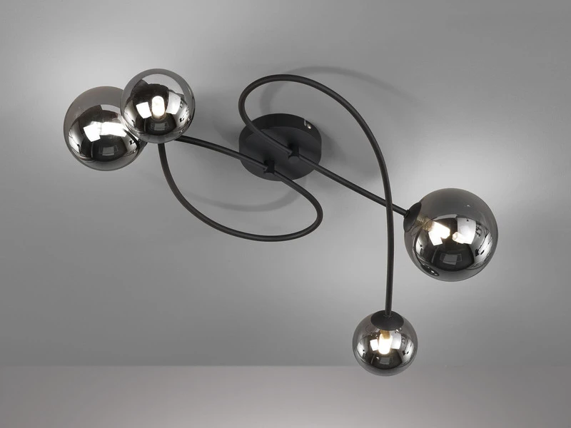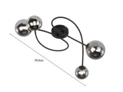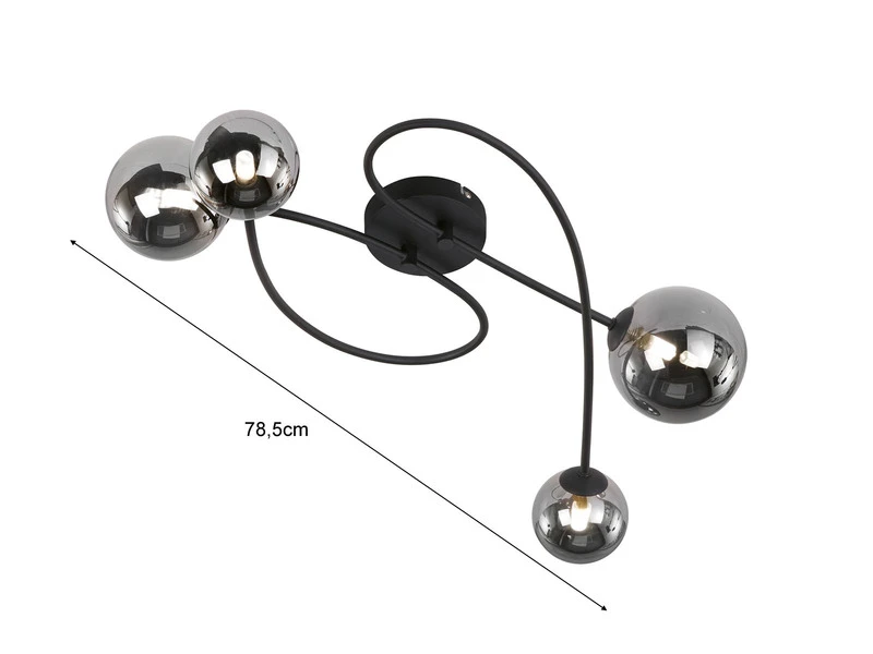 Gefertigt ist die 78,5cm lange und 37cm breite Deckenleuchte aus stilvoll geschwungenem, matt schwarzem Metall und 4 unterschiedlich großen Rauchglas Kugeln. Diese haben einen Durchmesser von 2x 10cm, 1x 12cm sowie 1x 14cm.