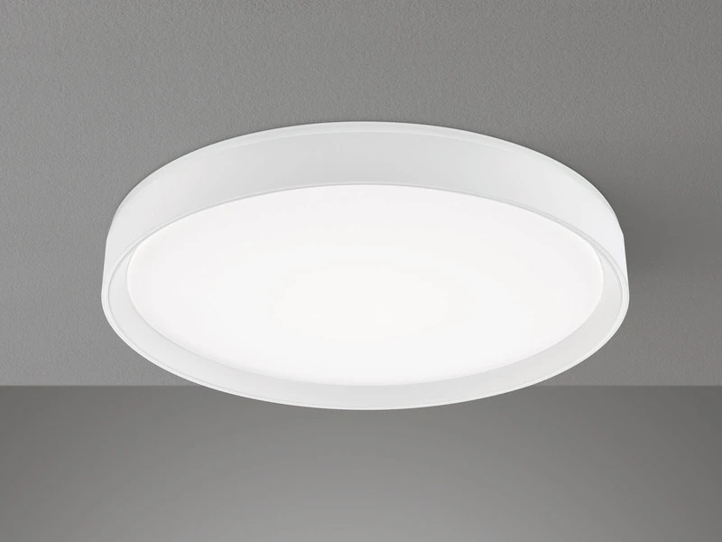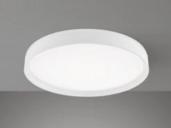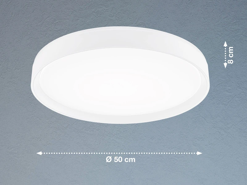 Die flache Deckenleuchte aus weißem Metall ist mit einer Höhe von gerade einmal 8 cm sehr flach und hat einen Durchmesser von 50 cm. Die Abdeckung aus weißem Acrylglas sorgt für ein blendfreies und gleichmäßig helles Licht.