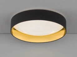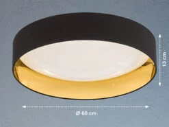 Der Korpus der runden Deckenlampe besteht aus einer 13 cm hohen Umrandung aus schwarzem Textil und einer weißen Abdeckung aus Acrylglas mit eingearbeitetem Sternenhimmel Dekor. Die Innenseite der Umrandung ist goldfarbig glänzend und sorgt für eine zauberhafte Sternlicht Reflektion.