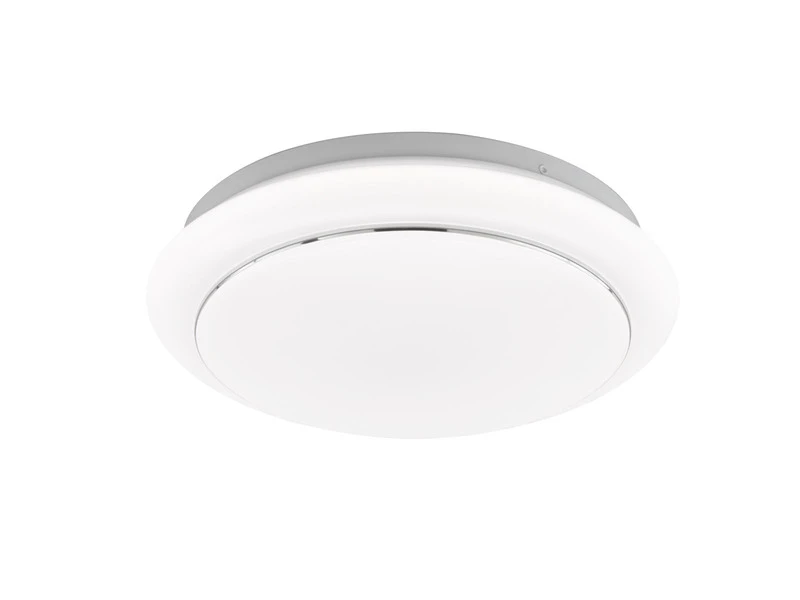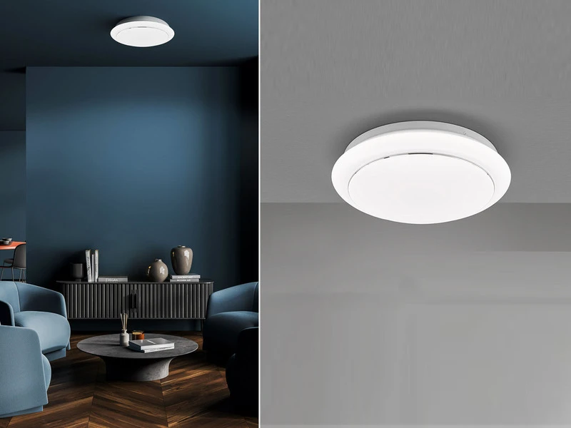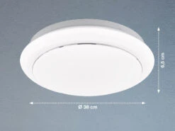 Das flache Deckenlicht aus weißem Metall ist mit einer Höhe von 6,5 cm sehr flach und hat einen Durchmesser von 38 cm. Die Abdeckung aus weißem Acrylglas sorgt für ein blendfreies und gleichmäßig helles Licht.