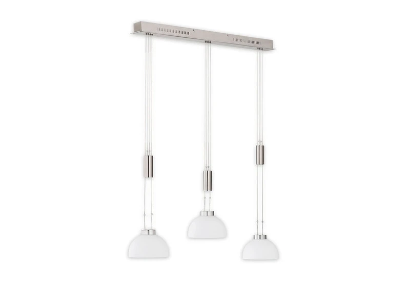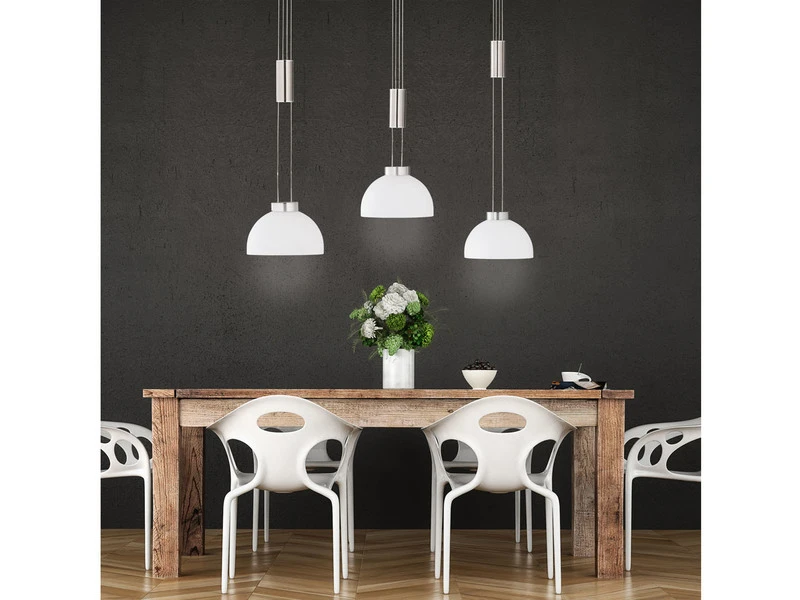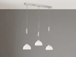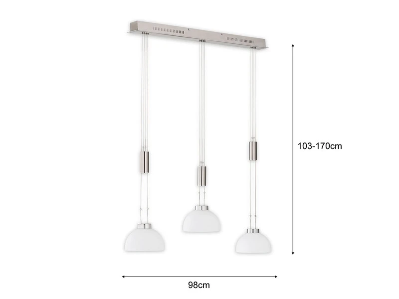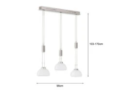 Die drei Lampenschirme haben einen Durchmesser von jeweils 20cm und sind aus hochwertigem, weißem Opalglas gefertigt. Sie bilden eine perfekte Einheit mit der filigranen, silberfarbenen Abhängung aus Metall. Insgesamt hat die Pendelleuchte eine Länge von 98cm.
