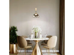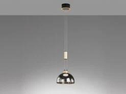 Der Lampenschirm hat einen Durchmesser von 25cm und ist aus hochwertigem Rauchglas gefertigt. Er bildet eine perfekte Einheit mit der filigranen, schwarzen Metall Abhängung, dem Blattgoldfarbenen Gegengewicht und der ebenfalls Blattgoldfarbenen Lampenschirmaufhängung.