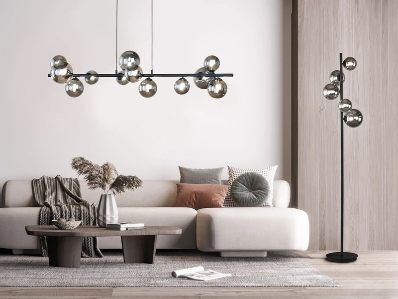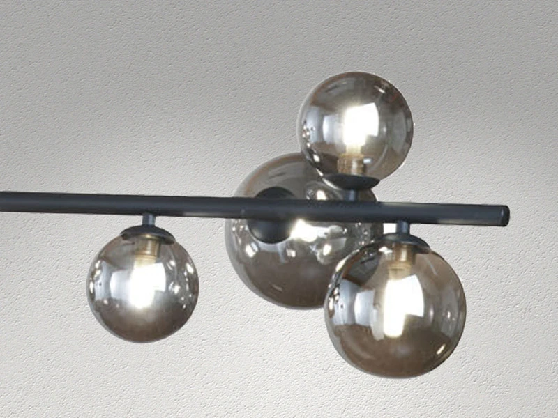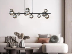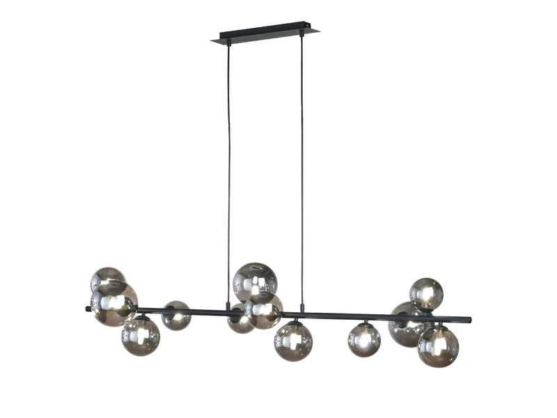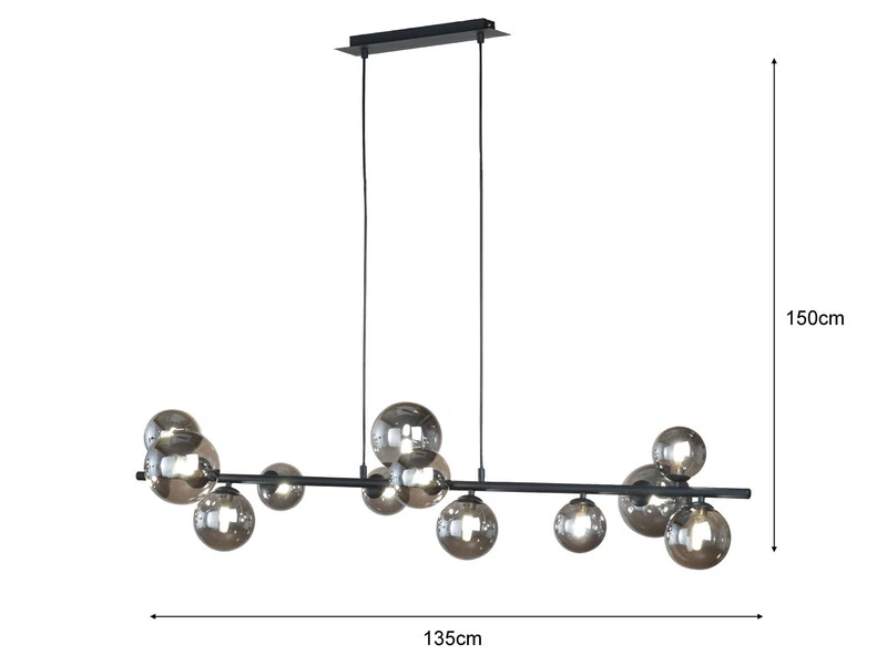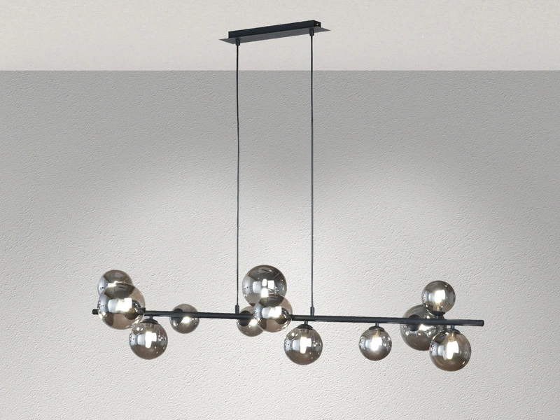 Gefertigt ist die 135cm lange und 32,5cm breite Pendelleuchte aus einem schmalen, matt schwarzen Metall Balken und 12 Rauchglas Kugeln, wobei die Kugeln unterschiedliche Durchmesser (10cm, 12cm und 14cm) haben. Die AbhÀngung betrÀgt 150cm.