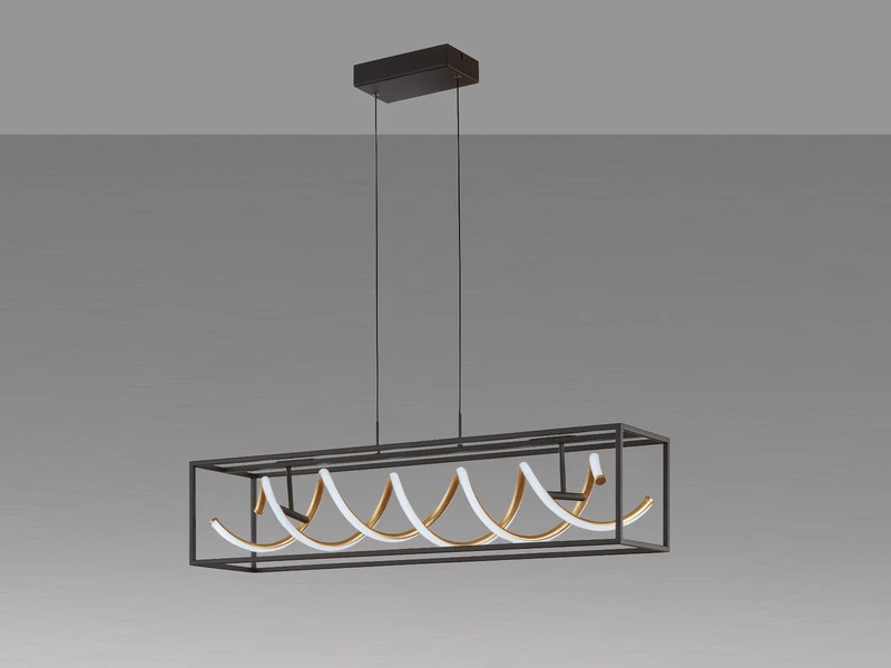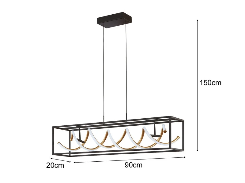 Unterstrichen wird das glamouröse Erscheinungsbild der 90cm langen und 20cm breiten Pendelleuchte durch die perfekt aufeinander abgestimmte Farbkombination von elegantem Mattschwarz und luxuriösem Blattgold / Weiß. Die Deckenabhängung beträgt 150cm und kann individuell eingestellt werden.
