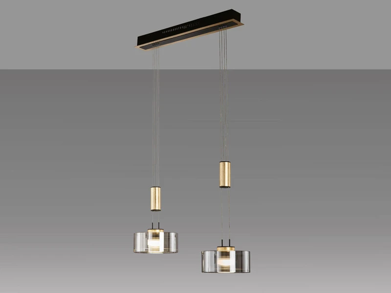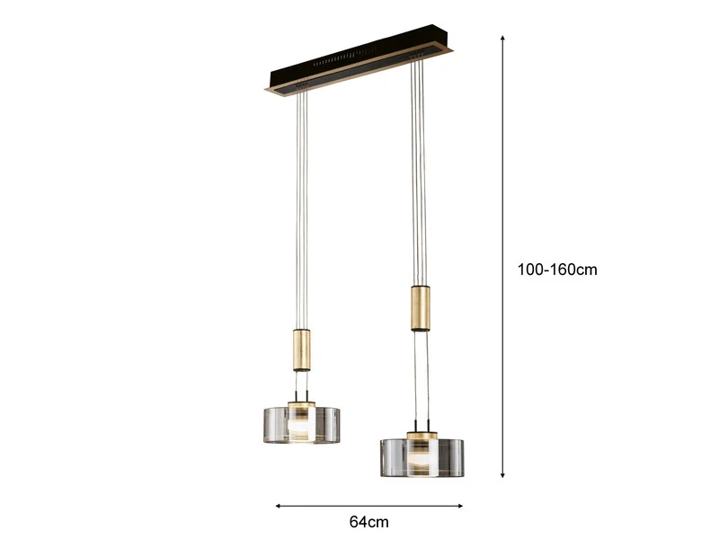 Die zwei runden Lampenschirme haben einen Durchmesser von jeweils 19cm und sind aus hochwertigem Rauchglas gefertigt. Sie bilden eine perfekte Einheit mit der filigranen, schwarzen Metall Abhängung, den Blattgoldfarbenen Gegengewichten und den ebenfalls Blattgoldfarbenen Lampenschirmaufhängungen. Insgesamt hat die Pendelleuchte eine Länge von 64cm.