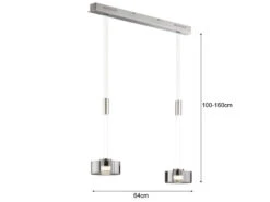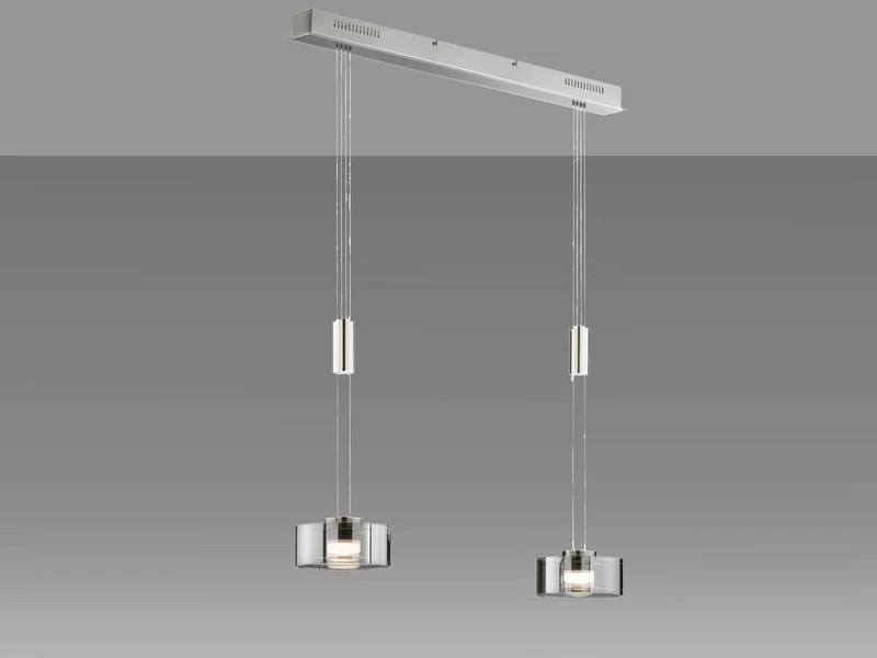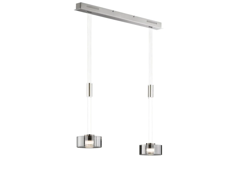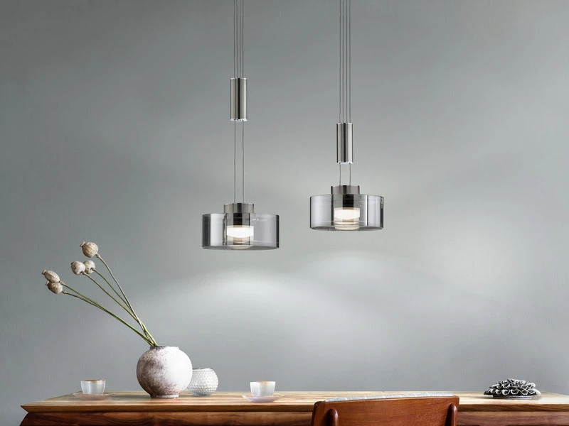 Die zwei runden Lampenschirme haben einen Durchmesser von jeweils 19cm und sind aus hochwertigem Rauchglas gefertigt. Sie bilden eine perfekte Einheit mit der filigranen, silberfarbenen Metall Abhängung. Insgesamt hat die Pendelleuchte eine Länge von 64cm.