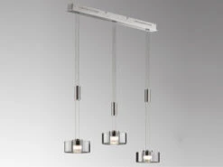 Die drei runden Lampenschirme haben einen Durchmesser von jeweils 19cm und sind aus hochwertigem Rauchglas gefertigt. Sie bilden eine perfekte Einheit mit der filigranen, silberfarbenen Metall AbhÀngung. Insgesamt hat die Pendelleuchte eine LÀnge von 100cm.