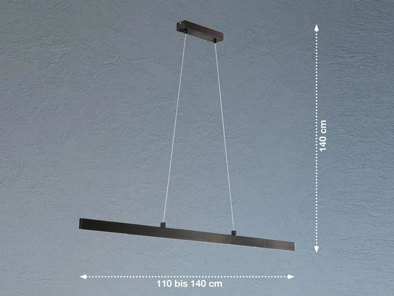 Die Pendelleuchte hat eine AbhĂ€ngung von 140cm und ĂŒberzeugt nicht nur durch ihre Ă€sthetische Perfektion, sondern auch durch ihre technische Raffinesse. Ein fest verbautes, leistungsstarkes LED Modul mit 24 Watt und 3500 Lumen erzeugt ein warmweiĂes Licht, das jeden Moment in ein harmonisches Leuchten taucht.