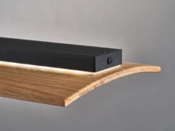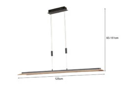 Die Balken Pendelleuchte hat eine GesamtlÀnge von 125cm. Der hochwertige, leicht gewölbte Echtholz Lampenschirm ist aus geölter Eiche gefertigt und mit 22cm extra breit. Er steht in perfekter Symbiose mit der AbhÀngung aus matt schwarzem Metall.
