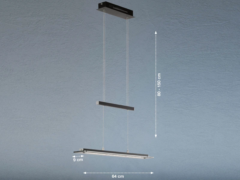Ihr gesamtes Spektrum zeigt die Balken Pendelleuchte, wenn Sie sie einschalten: Ăber den Taster am Leuchtenkorpus können Sie die Helligkeit stufenlos dimmen sowie die Lichtfarbe in 3 Stufen von WarmweiĂ bis KaltweiĂ einstellen (Tunable White). So können Sie Ihren Wohn- oder GeschĂ€ftsraum ganz individuell und fast mit Tageslicht ausleuchten. Durch die praktische Höhenverstellbarkeit von 80 bis 150 cm passt sich das Pendel dabei Ihren perönlichen Gegebenheiten perfekt an.