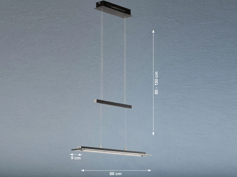 Ihr gesamtes Spektrum zeigt die Balken Pendelleuchte, wenn Sie sie einschalten: Ăber den Taster am Leuchtenkorpus können Sie die Helligkeit stufenlos dimmen sowie die Lichtfarbe in 3 Stufen von WarmweiĂ bis KaltweiĂ einstellen (Tunable White). So können Sie Ihren Wohn- oder GeschĂ€ftsraum ganz individuell und fast mit Tageslicht ausleuchten. Durch die praktische Höhenverstellbarkeit von 80 bis 150 cm passt sich das Pendel dabei Ihren perönlichen Gegebenheiten perfekt an.