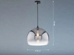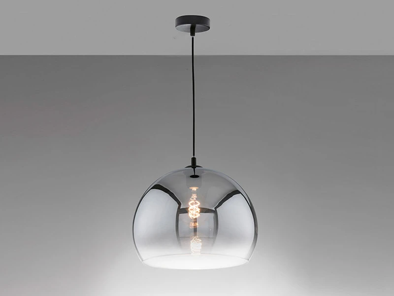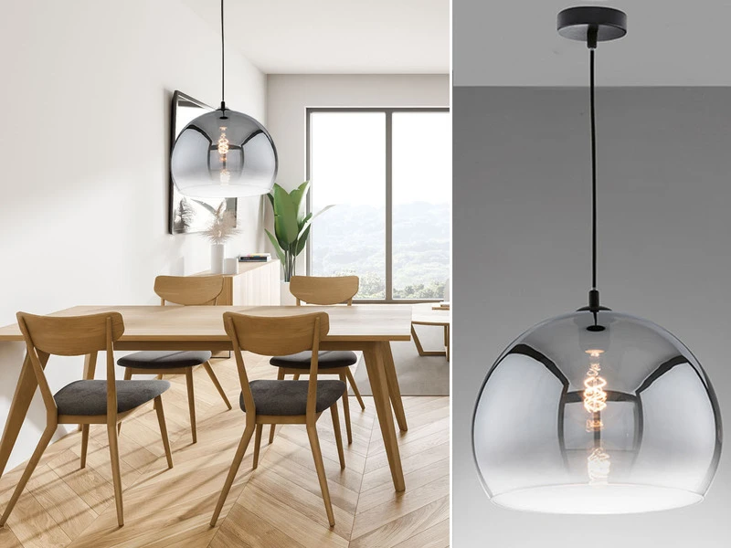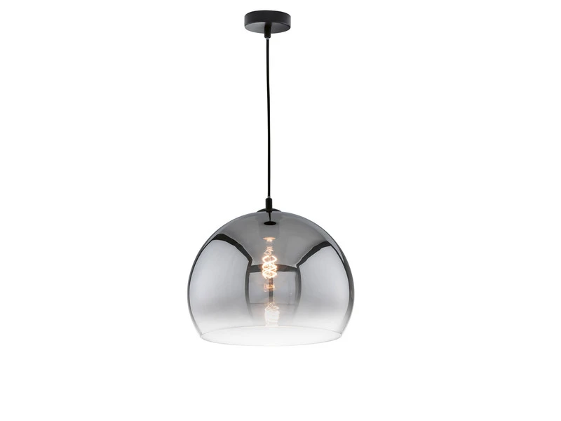Die Design Pendelleuchte besteht aus einem rauchfarbenem Glasschirm, der nach unten hin klar ausläuft und einen Durchmesser von 35 cm hat, sowie einer sandschwarzen, 150 cm langen Aufhängung. Der Industrial Look der Leuchte wird durch den angesagten Farb- und Materialmix perfekt abgerundet und sorgt für ein tolles Erscheinungsbild.