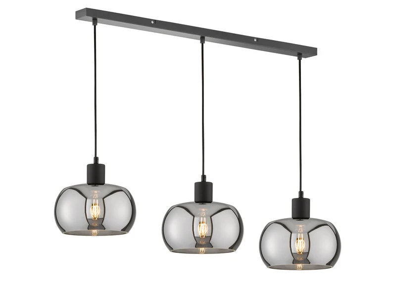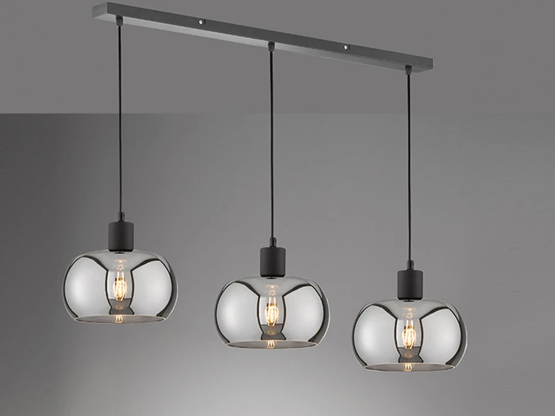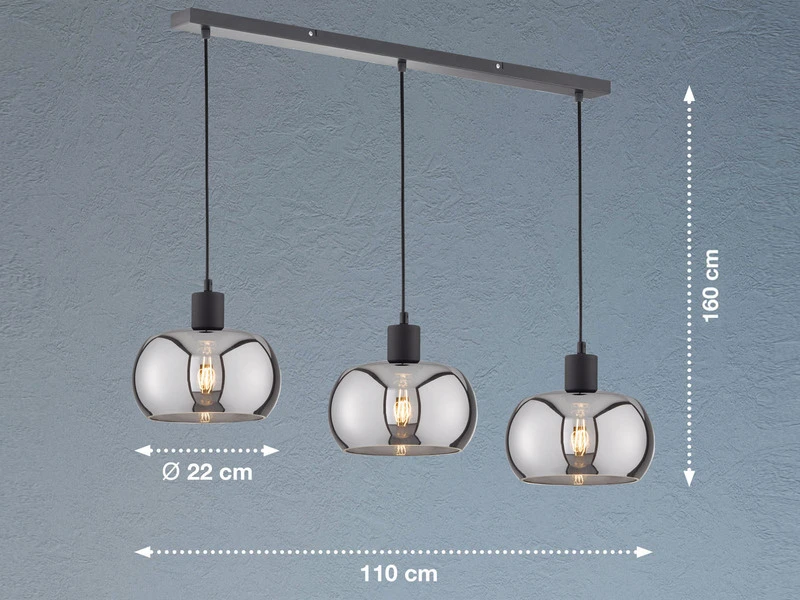 Die Design Pendelleuchte besteht aus drei rauchfarbenen Glasschirmen mit einem Durchmesser von jeweils 22 cm sowie einer sandschwarzen, 160 cm langen AufhÀngung. Die GesamtlÀnge der Leuchte betrÀgt 110 cm.