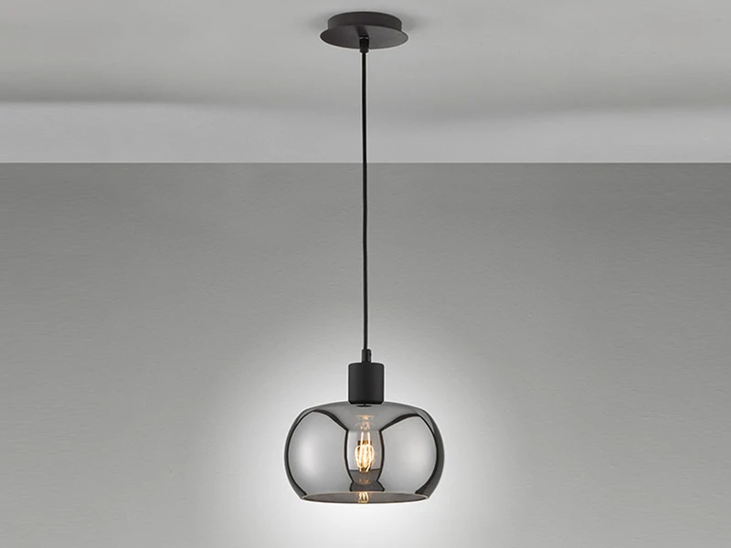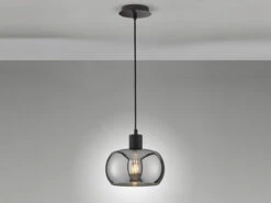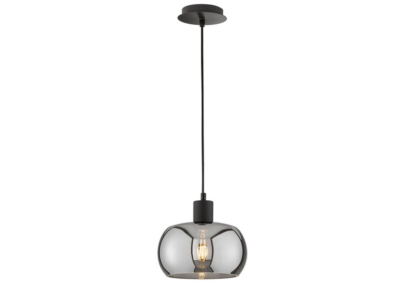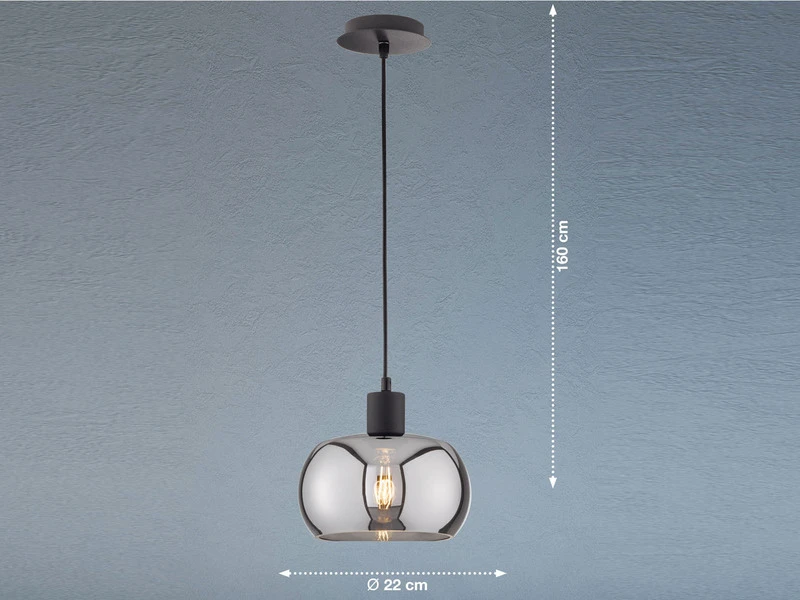 Die Design Pendelleuchte besteht aus einem rauchfarbenem Glasschirm mit einem Durchmesser von 22 cm sowie einer sandschwarzen, 160 cm langen Aufhängung. Der Industrial Look der Leuchte wird durch den angesagten Farb- und Materialmix perfekt abgerundet und sorgt für ein tolles Erscheinungsbild.