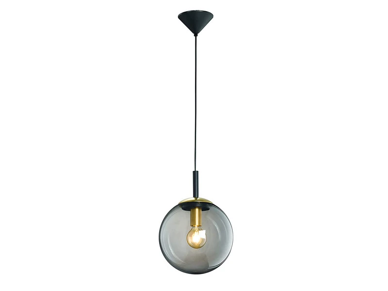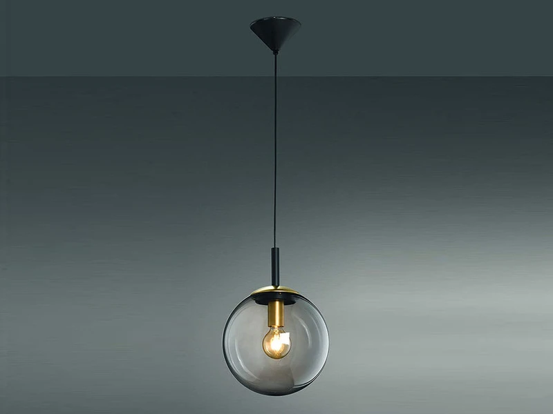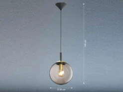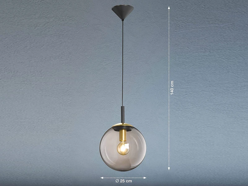 Die Retro Kugellampe hat einen Durchmesser von 25 cm und eine 140 cm lange, schwarze Abhängung, welche im Zusammenspiel mit dem messingfarbenen Finish ein harmonisches Gesamtbild schafft. Sie eignet sich perfekt, um Flur und Eingangsbereiche sowie den Esstisch oder das Wohnzimmer optimal auszuleuchten. Die Kugel aus rauchfarbenem Glas sorgt hierbei noch einmal für eine ganz besondere Lichtatmosphäre.