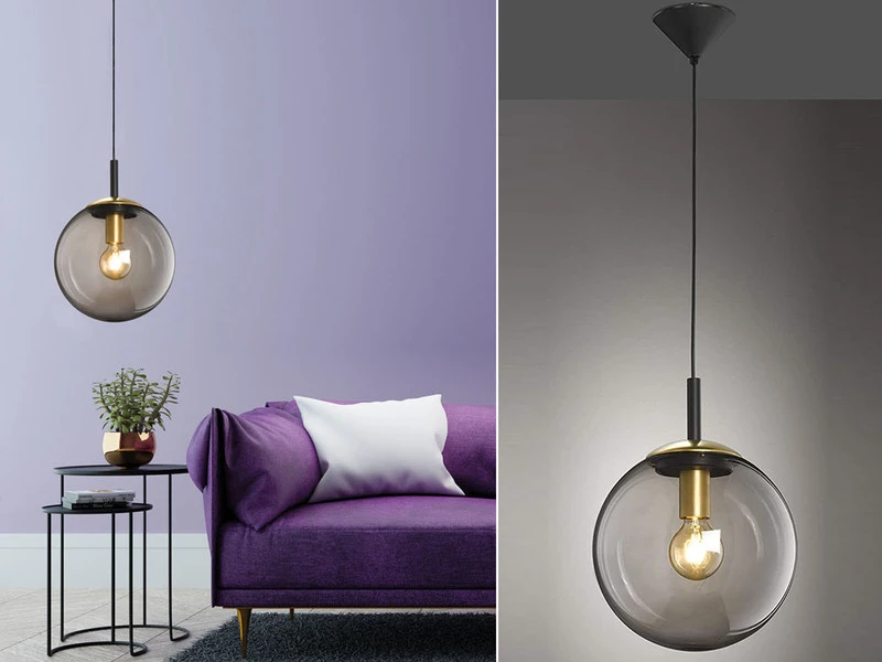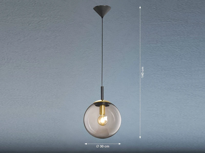 Die Retro Kugellampe hat einen Durchmesser von 30 cm und eine 140 cm lange, schwarze AbhĂ€ngung, welche im Zusammenspiel mit dem messingfarbenen Finish ein harmonisches Gesamtbild schafft. Sie eignet sich perfekt, um Flur und Eingangsbereiche sowie den Esstisch oder das Wohnzimmer optimal auszuleuchten. Die Kugel aus rauchfarbenem Glas sorgt hierbei noch einmal fĂŒr eine ganz besondere LichtatmosphĂ€re.