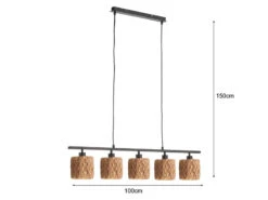 Die 5 flammige Pendelleuchte HYAZINTHE strahlt einen gemĂŒtlichen Hauch des angesagten Boho Styles aus. Mit ihren jeweils 13cm groĂen Lampenschirmen aus geflochtenem Seegras und der matt schwarzen, 150cm langen AufhĂ€ngung kommt die 100cm lange HĂ€ngelampe ĂŒber jedem Tisch perfekt zur Geltung. Sei es ĂŒber Ihrem Esszimmertisch, dem KĂŒchentisch oder im Wohnzimmer ĂŒber dem Couchtisch.