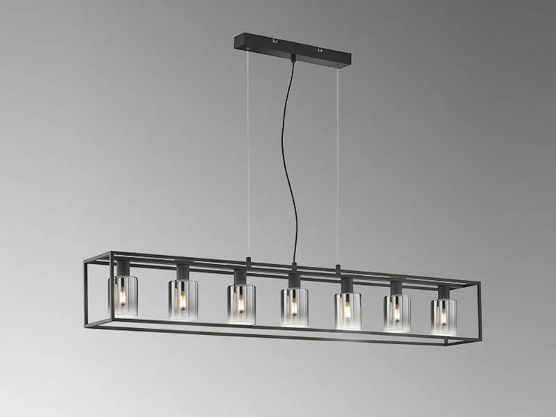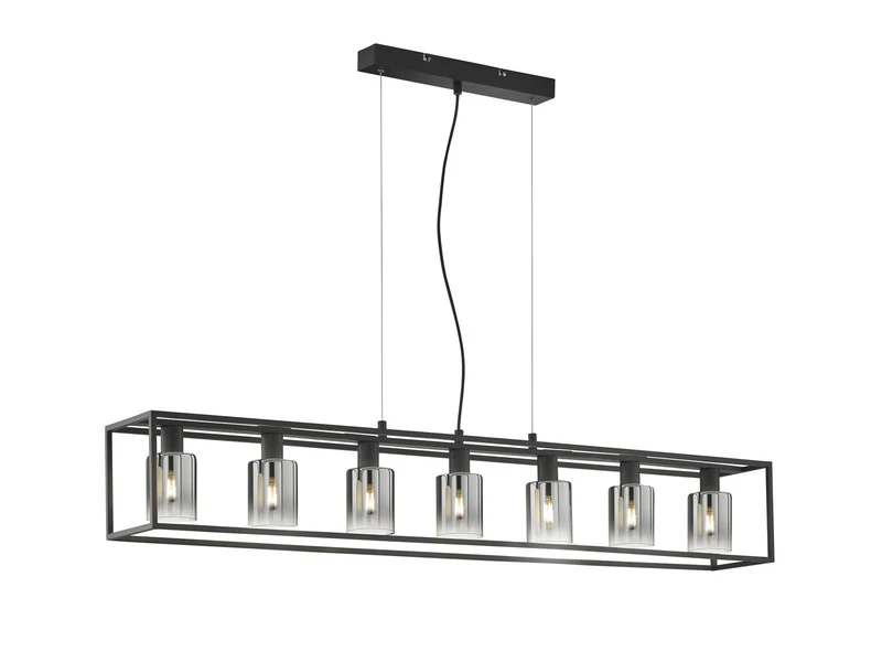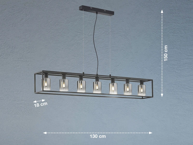Die Design HĂ€ngeleuchte setzt sich aus sieben zylinderförmigen Rauchglasschirmen mit einem Durchmesser von jeweils 8,5 cm (Höhe 11 cm) und einem sandschwarzen Metallrahmen zusammen. Die GesamtlĂ€nge der Leuchte betrĂ€gt 130 cm, die DeckenabhĂ€ngung 150 cm. Der Industrial Look wird durch den angesagten Farb- und Materialmix perfekt abgerundet und sorgt fĂŒr ein tolles Erscheinungsbild.