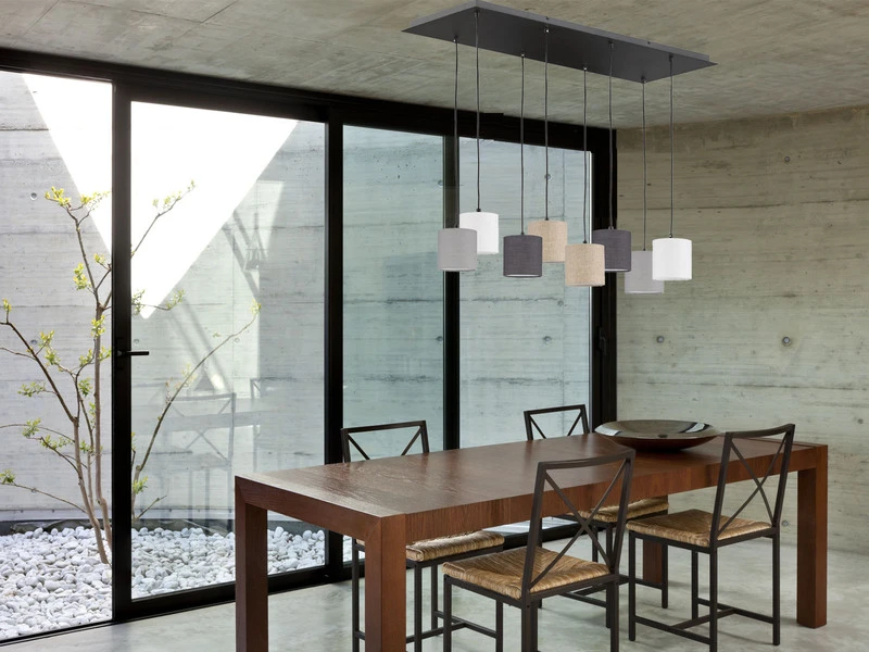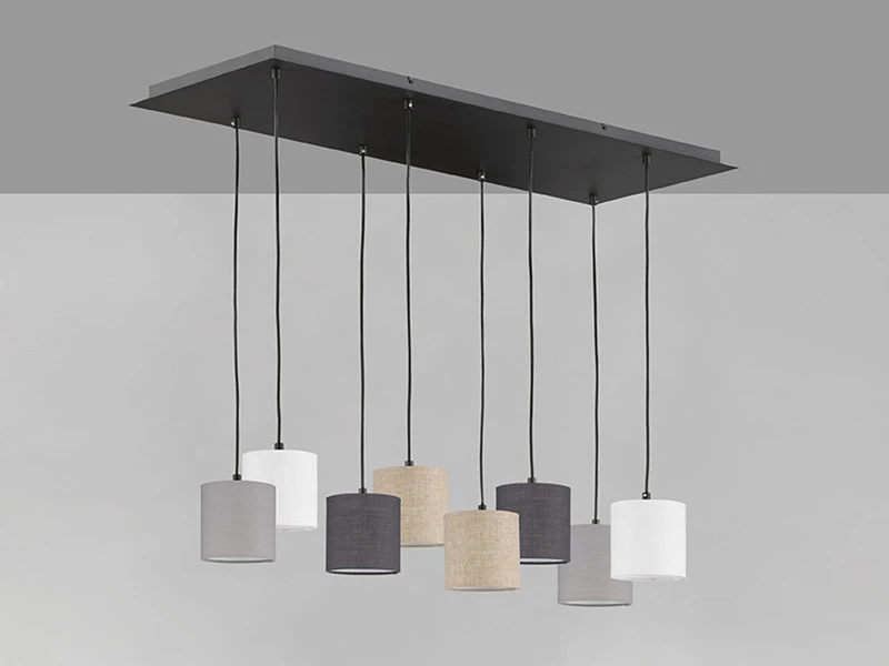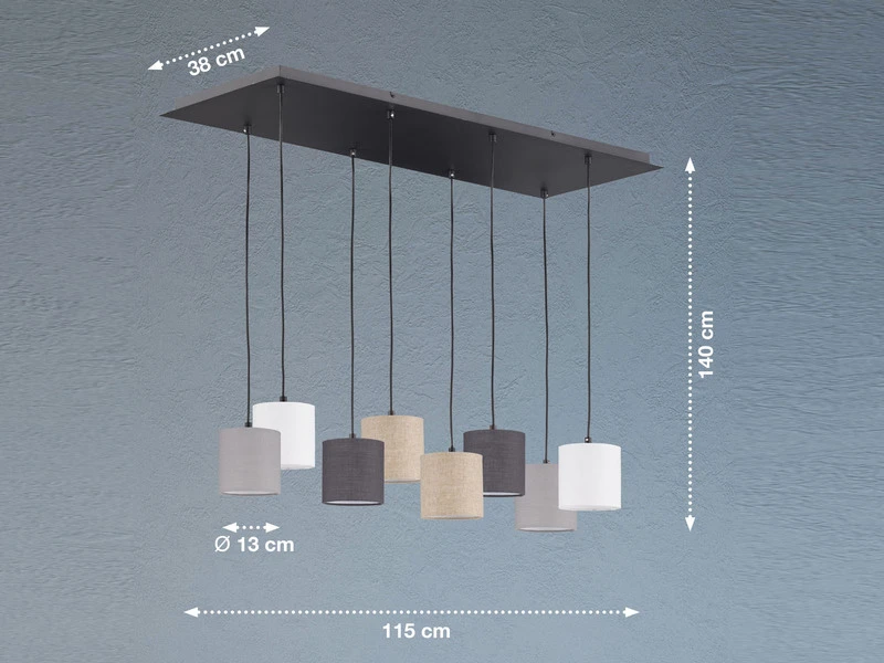 Die Design Hängeleuchte setzt sich aus acht zylinderförmigen Leinenstoffschirmen in Weiß, Sandfarben, Hellgrau und Dunkelgrau mit einem Durchmesser von jeweils 13 cm und einer sandschwarzen Metallplatte zusammen. Die Gesamtgröße der Leuchte beträgt 115×38 cm, die Deckenabhängung 140 cm. Der moderne Look wird durch den angesagten Farb- und Materialmix perfekt abgerundet und sorgt für ein tolles Erscheinungsbild.