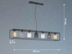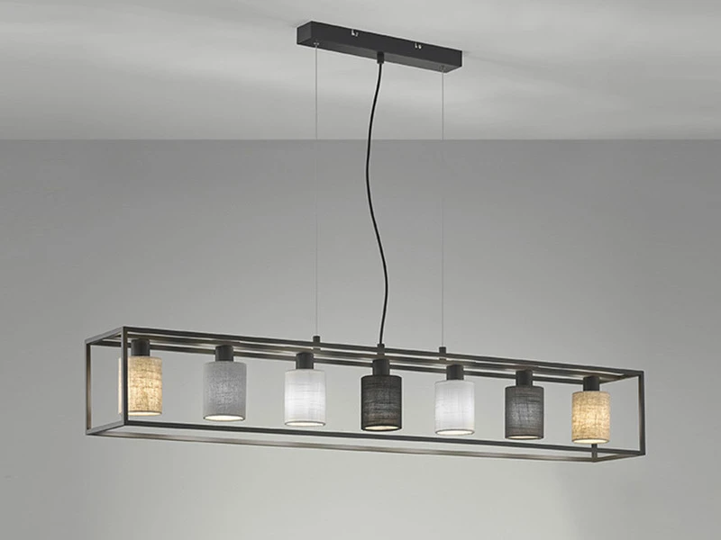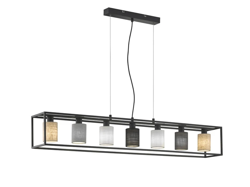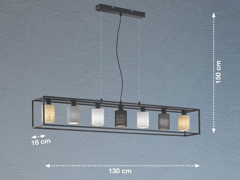 Die Design HĂ€ngeleuchte setzt sich aus sieben zylinderförmigen Leinenstoffschirmen in WeiĂ, Sandfarben, Schwarz und Hellgrau mit einem Durchmesser von jeweils 8,5 cm und einem sandschwarzen Metallrahmen zusammen. Die GesamtlĂ€nge der Leuchte betrĂ€gt 130 cm, die DeckenabhĂ€ngung 150 cm. Der moderne Look wird durch den angesagten Farb- und Materialmix perfekt abgerundet und sorgt fĂŒr ein tolles Erscheinungsbild.