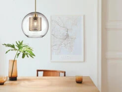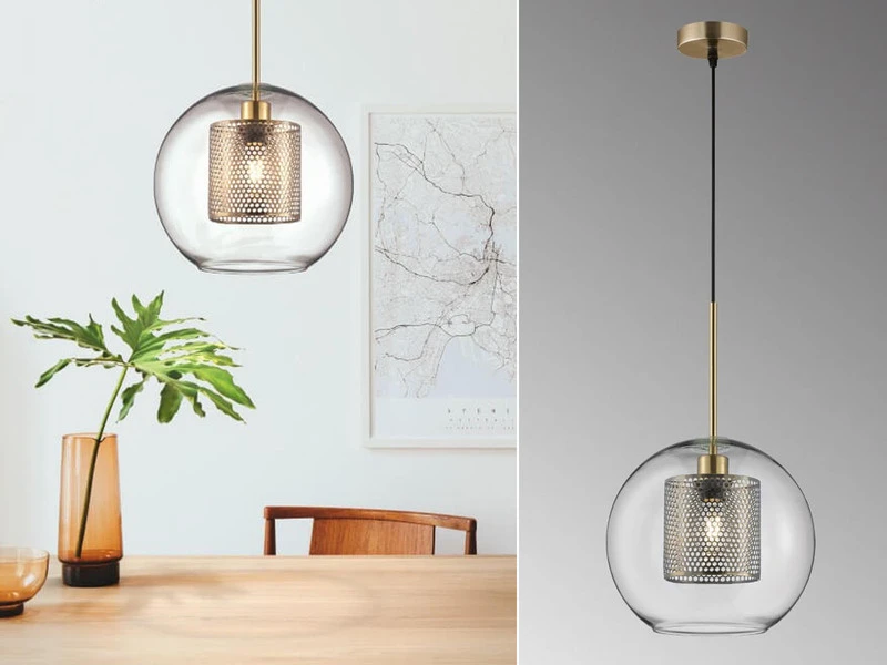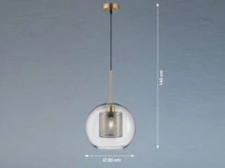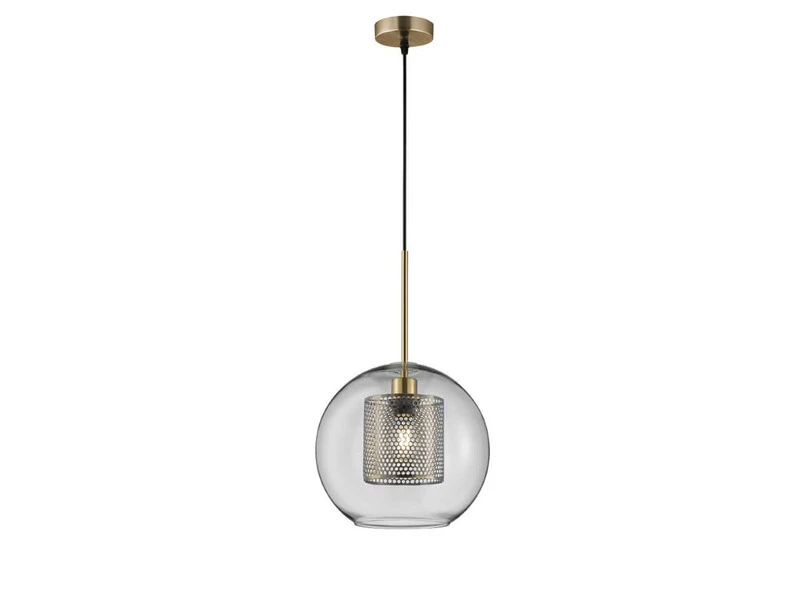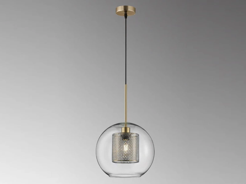 Die Faszination der einflammigen Pendelleuchte entsteht durch den auffÀlligen Form- und Materialmix einer klaren Glaskugel mit 25cm Durchmesser und dem darin liegenden, messingfarbenen Metall Lampenschirm mit wabenförmigem Lochmuster sowie einer 140 cm langen AbhÀngung, die ebenfalls in Messing matt mit schwarzem Kabel gehalten ist.