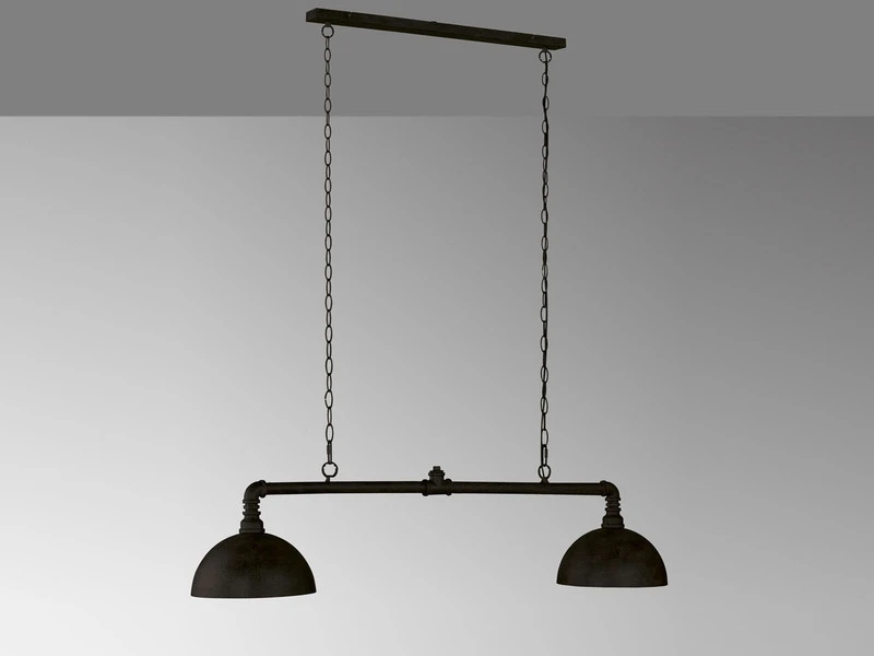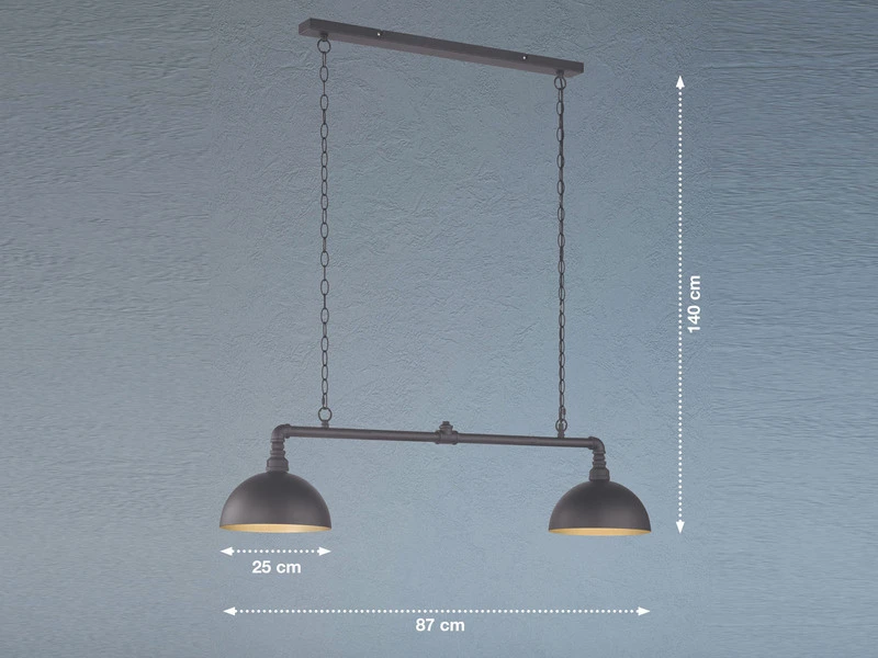 Das besondere Erscheinungsbild der 2 flammigen HÀngeleuchte entsteht durch den charakteristischen Leuchtenkorpus im Design Rohr sowie die beiden 25 cm breiten, sandschwarzen Metallschirme mit goldfarbener InnenflÀche. Genau dieser Look verleiht der Designklassiker Pendelleuchte den unverkennbaren Charme einer alten Fabrikleuchte.