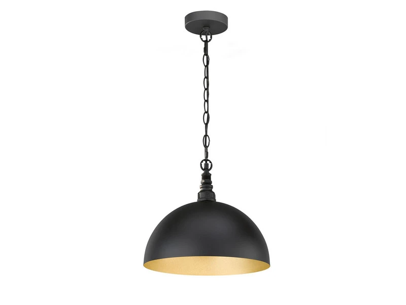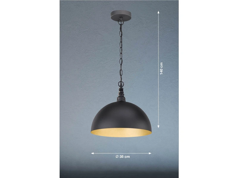 Das besondere Erscheinungsbild der einflammigen HÀngeleuchte entsteht durch den sandschwarzen Metallschirm mit goldfarbener InnenflÀche, wobei der 35 cm breite Lampenschirm an die Leuchten in alten Fabriken erinnert.