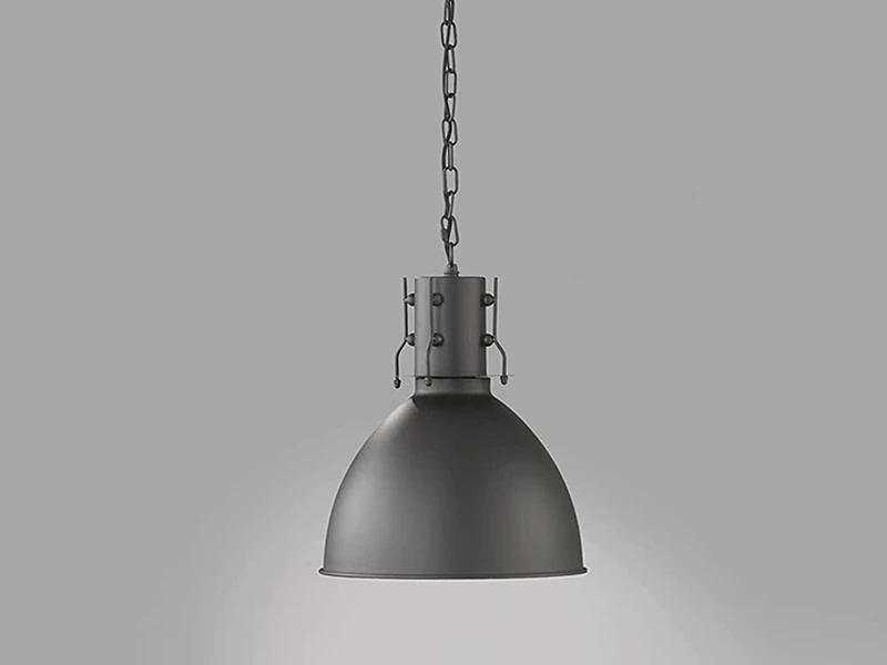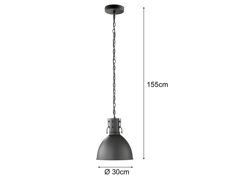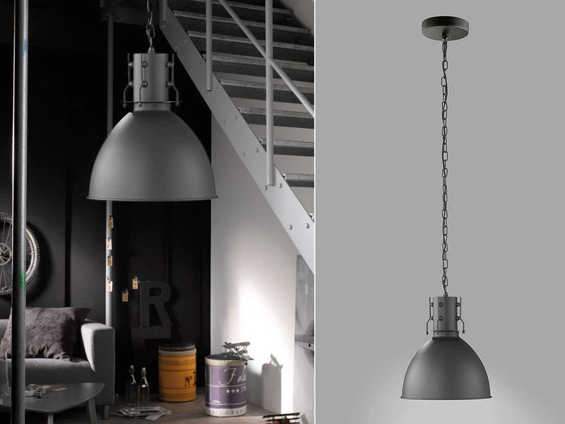 Das besondere Erscheinungsbild der einflammigen 30cm Ø Hängeleuchte entsteht durch den Metallschirm in Sandschwarz matt mit Silberfarbener Innenfläche, wobei der Lampenschirm an die Leuchten in alten Fabriken erinnert.