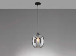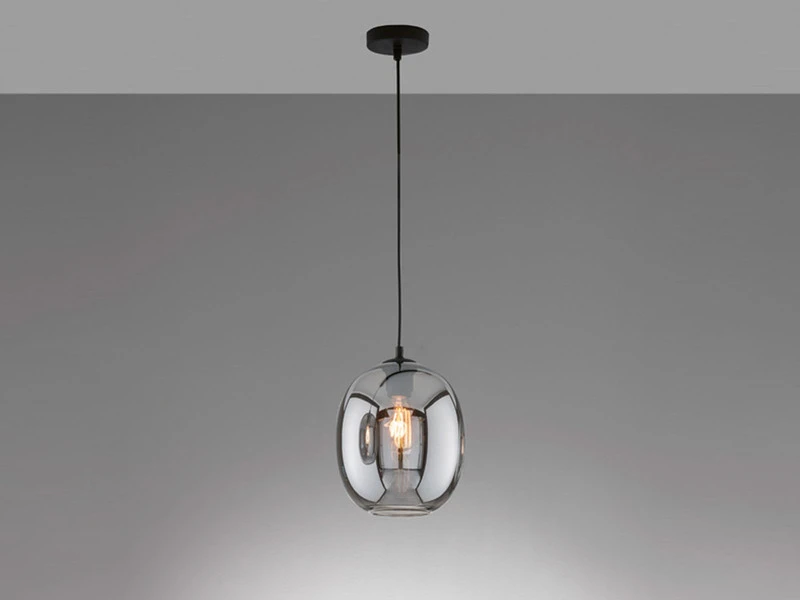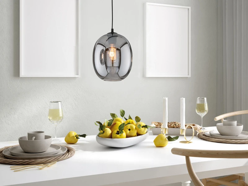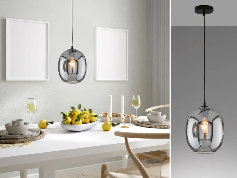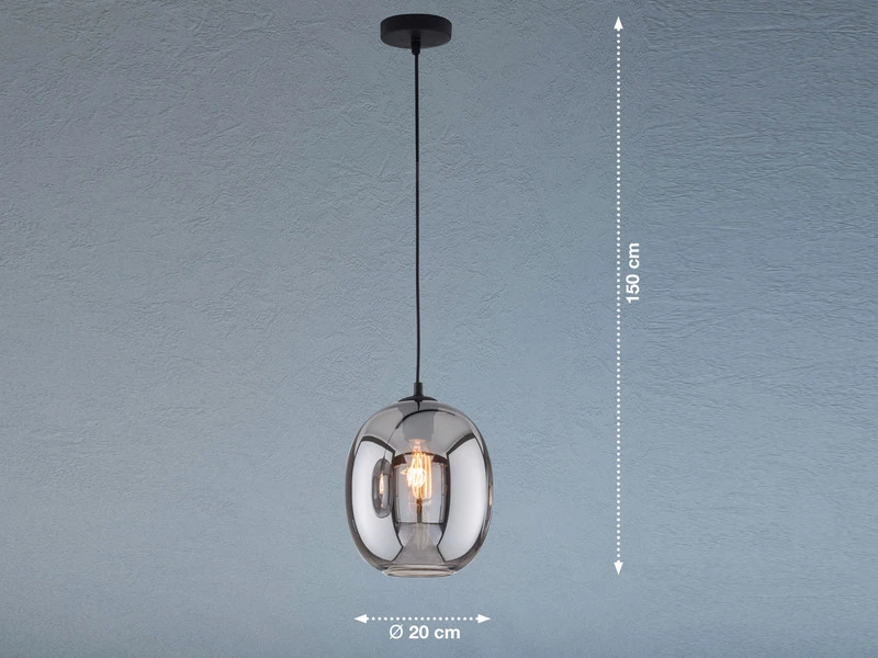 Die Design Hängeleuchte setzt sich aus einem kugelförmigen Rauchglasschirm mit einem Durchmesser von 21 cm sowie einer matt schwarzen, 150 cm langen Abhängung zusammen. Der Retro Look wird durch den angesagten Farb- und Materialmix perfekt abgerundet und sorgt für ein tolles Erscheinungsbild.