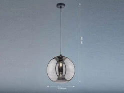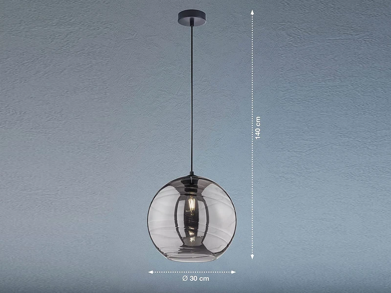 Die Retro Kugellampe hat einen Durchmesser von 30 cm und eine 140 cm lange, schwarze Abhängung. Sie eignet sich perfekt, um große und kleine Räume, Flur und Eingangsbereiche sowie den Esstisch oder das Wohnzimmer optimal auszuleuchten. Die Kugel aus rauchfarbenem, geschliffenem Glas sorgt hierbei noch einmal für eine ganz besondere Lichtatmosphäre.