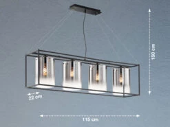 Die Design Hängeleuchte setzt sich aus vier zylinderfÜrmigen Rauchglasschirmen mit einem Durchmesser von jeweils 18 cm (HÜhe 25 cm) und einem matt schwarzen Metallrahmen zusammen. Die Gesamtlänge der Leuchte beträgt 115 cm, die Deckenabhängung 150 cm. Der Industrial Look wird durch den angesagten Farb- und Materialmix perfekt abgerundet und sorgt fßr ein tolles Erscheinungsbild.