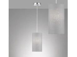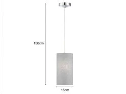Das Kennzeichnende der Pendelleuchte ist der graue Stoff Lampenschirm mit eingearbeitetem Dekor. Mit einem Durchmesser von 16cm sorgt er für ein angenehmes Licht und verleiht der Pendelleuchte ihren unverwechselbaren Charakter. Der Baldachin ist aus chromfarbenem Metall gefertigt und hat eine 150cm lange Abhängung.