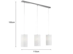 Das Kennzeichnende der Pendelleuchte sind die weißen Stoff Lampenschirme mit eingearbeitetem Dekor. Mit einem Durchmesser von jeweils 16cm sorgen sie für ein angenehmes Licht und verleihen der insgesamt 110cm langen Pendelleuchte ihren unverwechselbaren Charakter. Die Aufhängung ist aus chromfarbenem Metall gefertigt und 150cm lang.