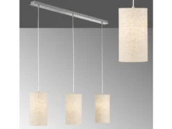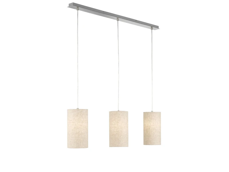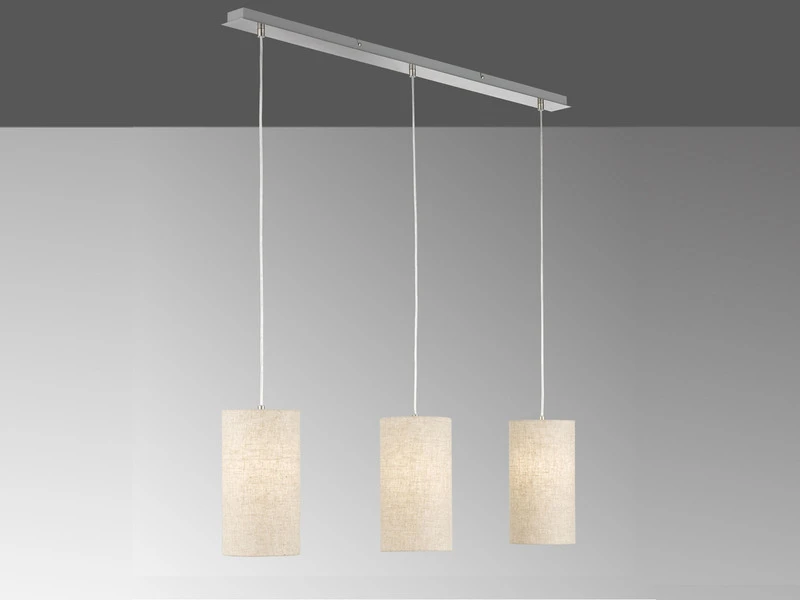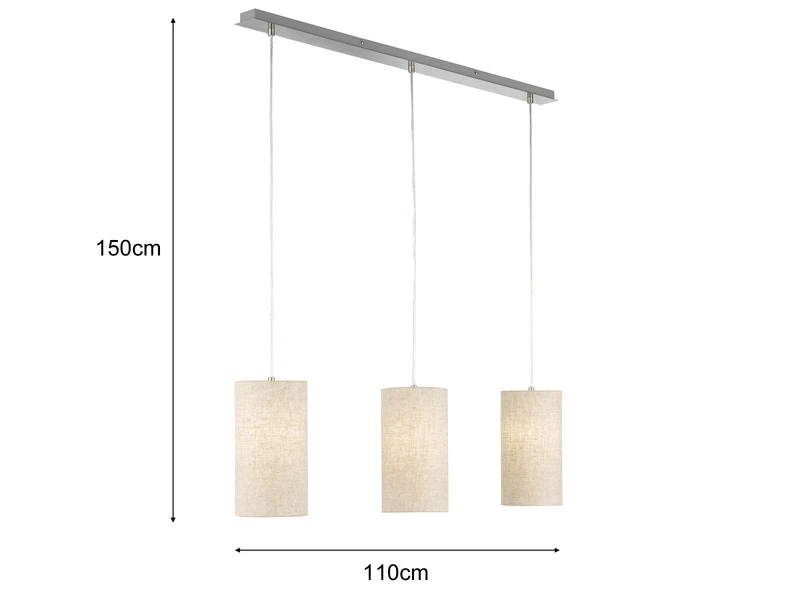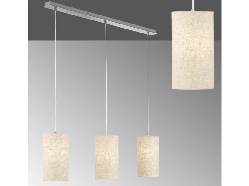 Das Kennzeichnende der Pendelleuchte sind die sandfarbenen Leinen Lampenschirme. Mit einem Durchmesser von jeweils 16cm sorgen sie für ein angenehmes Licht und verleihen der insgesamt 110cm langen Pendelleuchte ihren unverwechselbaren Charakter. Die Aufhängung ist aus nickelfarbenem Metall gefertigt und 150 cm lang.