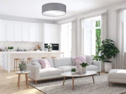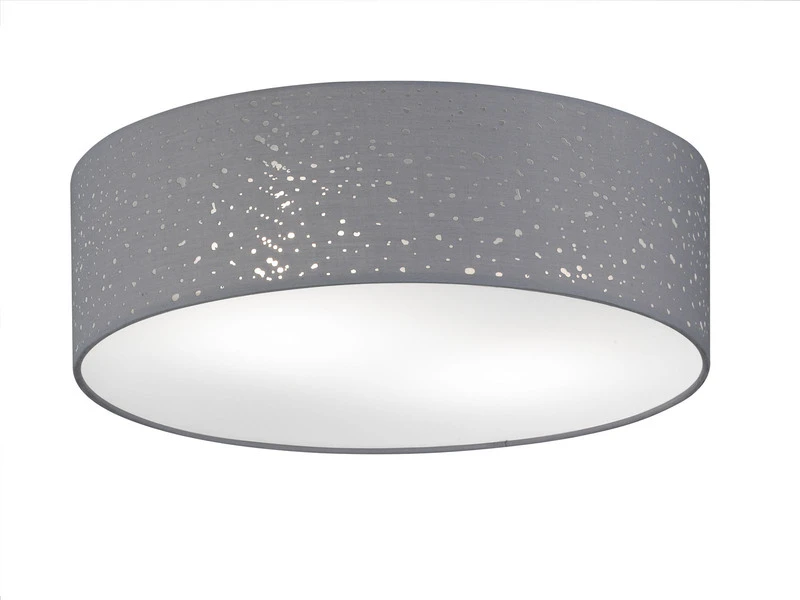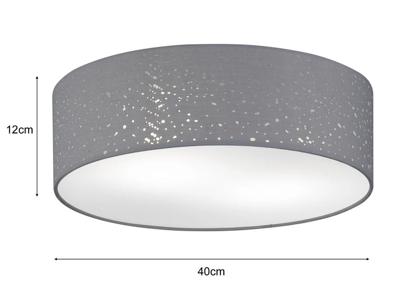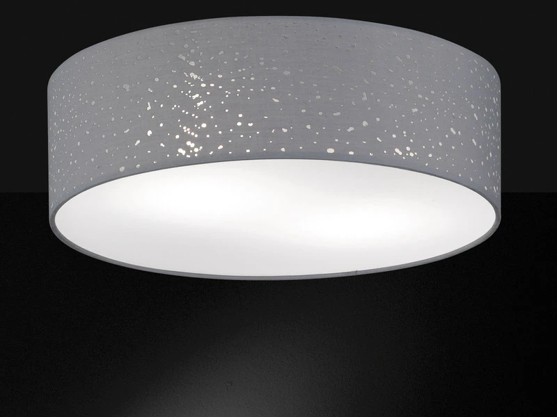 Der graue Stoffschirm mit stilvollem Dekor hat einen Durchmesser von 40 cm und eine Höhe von 12 cm. Das edle Erscheinungsbild der Deckenleuchte sorgt im Zusammenspiel mit der unteren, satinierten Acrylabdeckung fĂŒr ein harmonisches Ambiente. Bei Verwendung von entsprechend warmweiĂen Leuchtmitteln lĂ€sst sich dieser Effekt noch unterstreichen, indem die Deckenlampe ein besonders wohnliches Licht zaubert.